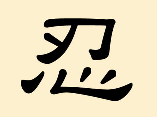 Das chinesische Zeichen 忍 (Ren) leitet sich ursprünglich aus dem Zeichen 能 (néng) ab, indem wiederum das Ideogramm 月 enthalten ist, das für Fleisch steht. In der Orakelknochenschrift bezeichnete 能 Hirsche, Rehe oder Rotwild. Diese Tiere hatte man aufgrund ihrer Stärke und kräftigen Statur geschätzt. Allmählich wandelte sich die Bedeutung und statt „Stärke" ist 能 im heutigen Sprachgebrauch mit „Fähigkeit" oder „Können" gleichzusetzen.