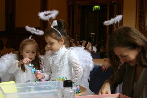Am Tisch saßen zwei sehr kleine Mädchen, sie waren als Engel verkleidet und verglichen ihre Lotusblumen.