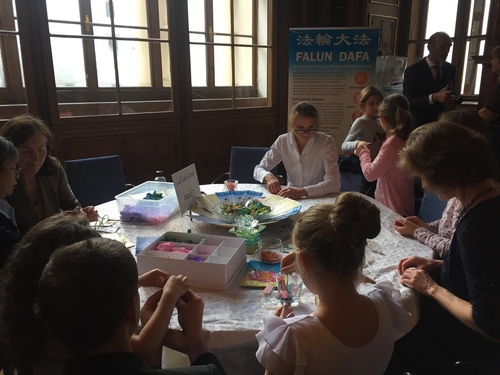 Kinder hatten die Möglichkeit Lotusblumen selbst zu basteln und über das traditionelle China und Falun Dafa zu erfahren. Mit zierlichen Fingern und gutem Geschmack suchten sie die Farben ihrer Blütenblätter aus und bemühten sich fleißig und geduldig, bis sie ihren Eltern voll Freude das Ergebnis vorstellen konnten.