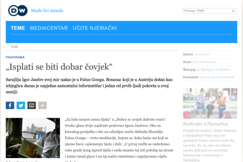 Igor Jančev dolazi iz Sarajeva, u Beču živi od početka od 1993 i osim što je samostalni informatičar, on je danas i jedan od prvih ljudi pokreta Falun Gong u Austriji. Falun Gong, to su zapravo pet meditacionih vježbi, četiri u stojećem i jedna u sjedecem položaju. Njima se, kaže Igor, pospješuje protok energije kroz cijelo tijelo i na taj način se sprečavaju uzroci za razne bolesti. Tijelo dobija eneregiju, čovjek postaje dinamičan i vitalan, no najprije smiren i tolerantan, kaže Igor Jančev: „Ima ona poslovica koja kaže „u zdravom tijelu, zdrav duh“. Isto važi i obratno. Ako imamo zdrav duh, imaćemo i zdravo tijelo“.