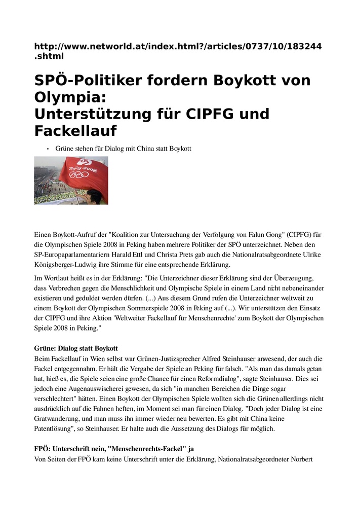 Networld.at - SPÖ-Politiker fordern Boykott von Olympia: Unterstützung für CIPFG und Fackellauf
