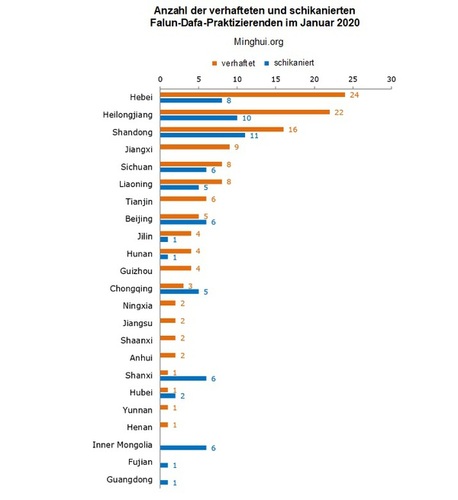(Minghui.org) Nach den von Minghui.org gesammelten Informationen wurden im Januar 2020 insgesamt 125 Falun-Dafa-Praktizierende [1] wegen ihres Glaubens verhaftet und 69 schikaniert. 58 der verhafteten Praktizierenden befinden sich zum Zeitpunkt der Berichterstattung noch in Haft.