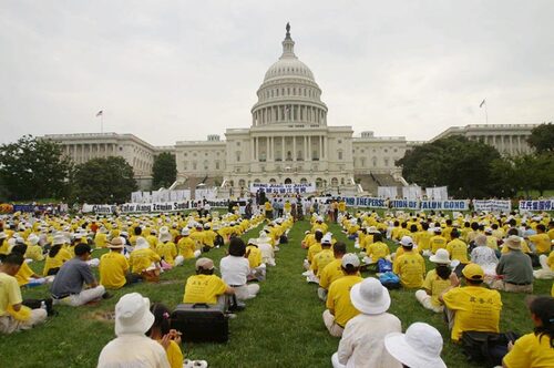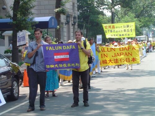 Am Montag versammelten sich mehr als 3000 Falun Gong- Praktizierende aus mehr als 60 Ländern der Welt beim Washington Denkmal und begannen dort ihren Marsch, mit einer Länge von 2,2 Meilen und einer Dauer von 2 Stunden, durch die Straßen der Innenstadt von Washington DC . Drei riesige Spruchbänder begleiteten den Weg: "Stoppt das Zertrampeln der Menschenrechte, stellt den Diktator Jiang Zemin vor Gericht", "Jiang Zemin kann der Verantwortung für Völkermord und Verbrechen gegen die Menschlichkeit nicht entfliehen", "Die Welt braucht Wahrhaftigkeit, Barmherzigkeit und Nachsicht".