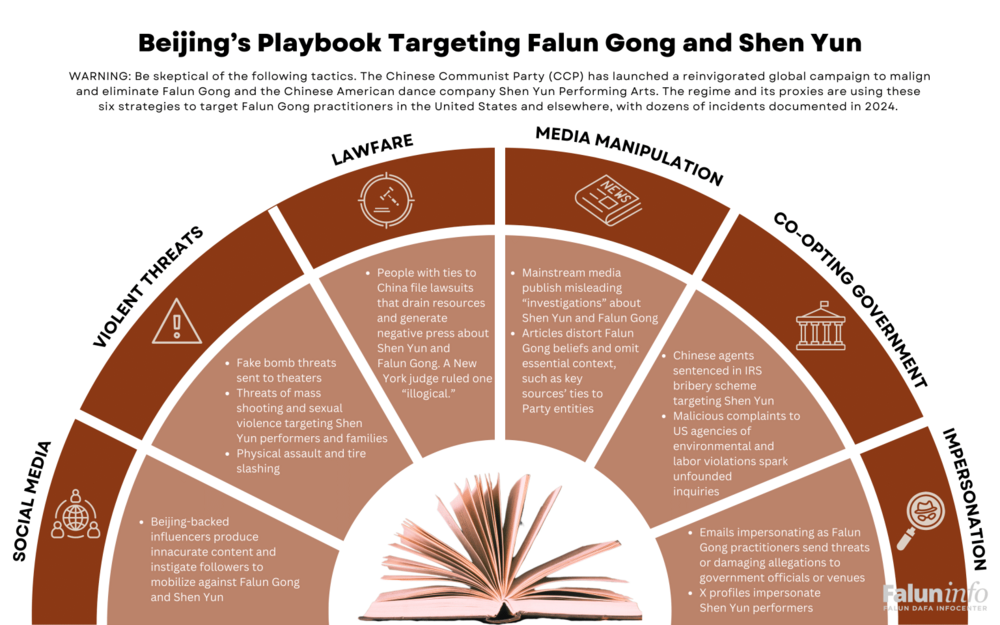 Wichtige Taktiken: Bisher äußerte sich die Kampagne in körperlichen Angriffen, gefälschten Bombendrohungen, grundlosen Klagen und der Verbreitung irreführender Behauptungen durch eine kleine Anzahl von Anstiftern in sozialen Medien und großen Medienunternehmen, insbesondere der New York Times. Sie haben auch versucht, Ermittlungen durch US-Behörden gegen Shen Yun zu veranlassen.
