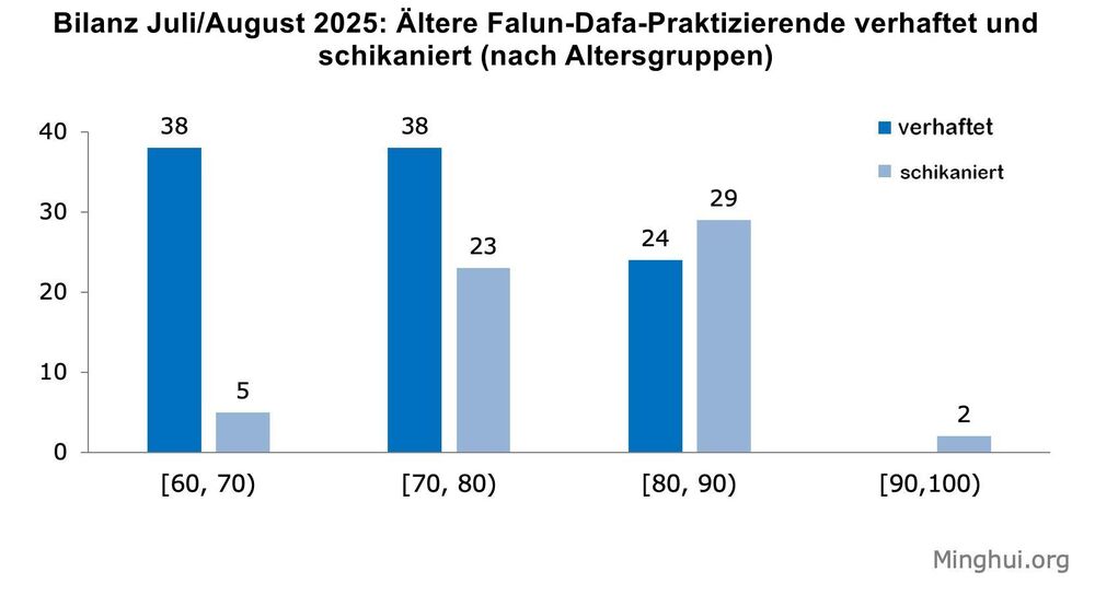 Im Juli und August 2025 wurden 937 neue Fälle bestätigt, in denen Falun-Dafa-Praktizierende wegen ihres Glaubens verhaftet oder schikaniert wurden. Von den neu bestätigten 937 Fällen waren 468 Verhaftungen und 469 Schikanen. Bei 319 Praktizierenden wurden die Wohnungen durchsucht und zwölf Praktizierende wurden in Gehirnwäsche-Einrichtungen festgehalten. Einige der Verfolgungen fanden bereits in früheren Jahren statt.