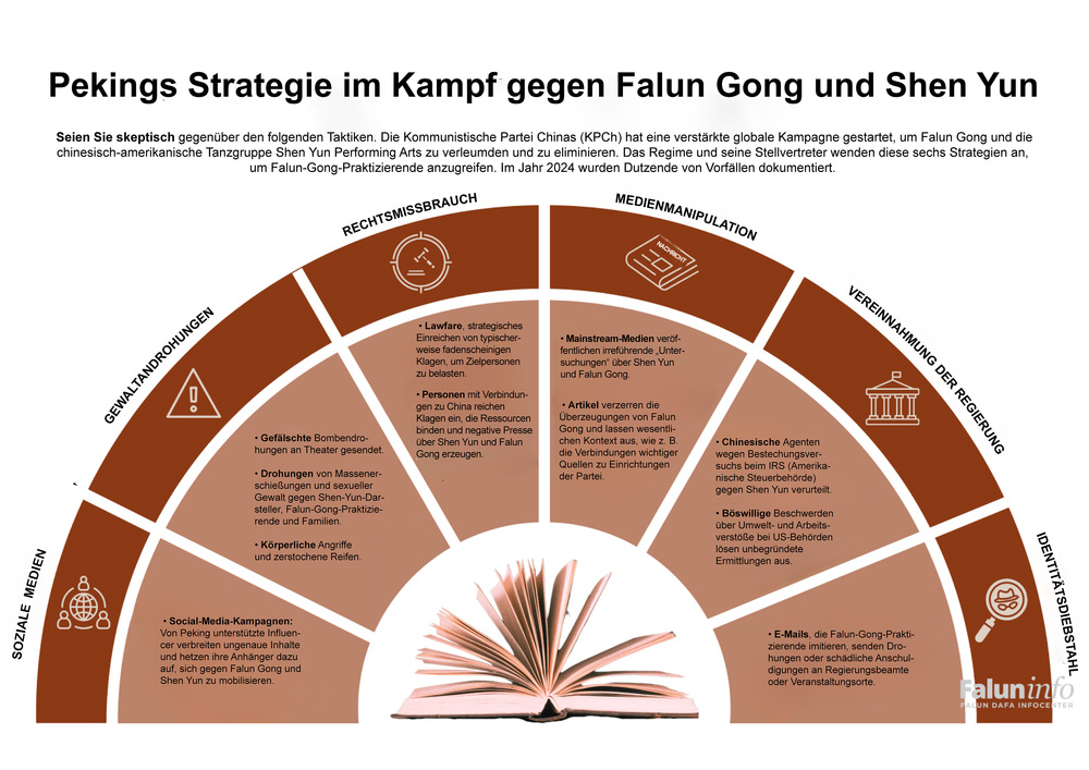 Das weltbekannte Shen Yun Performing Arts Ensemble für klassischen chinesischen Tanz und Musik, gegründet von Falun-Gong-Praktizierenden, war in der Spielzeit 2024–2025 wiederholt Ziel von Sabotageversuchen weltweit. Diese Vorgänge zeigen das globale Ausmaß der Bemühungen der KPCh, Stimmen zum Schweigen zu bringen, die ihre Menschenrechtsverletzungen aufdecken.