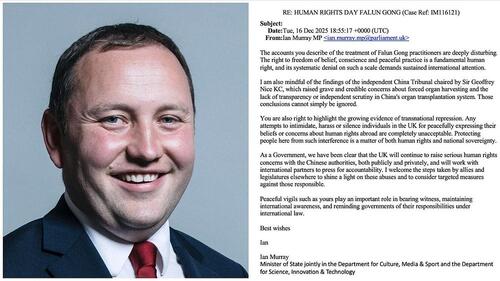 Praktikanti su u Ujedinjenom Kraljevstvu, na Međunarodni dan ljudskih prava, održali bdijenje uz svijeće i mirni protest u blizini kineske ambasade u Londonu 10. decembra 2025. godine. Gospodin Ian Murray, državni ministar u Odjeljenju za kulturu, medije i sport ...