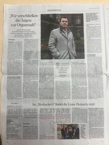 Lokalno izdanje novina Westdeutsche Allgemeine Zeitung (WAZ) u Gelsenkirchenu objavilo je 10. prosinca 2025., na Dan ljudskih prava, članak pod naslovom „Zatvaramo oči pred vađenjem organa“. U njemu se poziva Njemačka da obrati pozornost na od države odobreno prisilno vađenje organa od strane Komunističke partije Kine (KPK). Gelsenkirchen se nalazi u središnjem dijelu Sjeverne Rajne-Vestfalije u Njemačkoj i dio je gusto naseljenog metropolitanskog područja. WAZ je intervjuirao lokalnog stanovnika dr. Andreasa Webera, zamjenika direktora međunarodne organizacije za ljudska prava Liječnici protiv prisilnog uzimanja organa (DAFOH) i objavio članak na Dan ljudskih prava. Članak je citirao dr. Webera o misiji DAFOH-a: „Organizacija se više puta usredotočuje na Kinu – posebno na progon manjina poput Ujgura ili članova pokreta Falun Gong – duhovnog pokreta iz Kine ... “