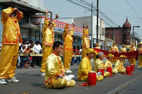 USA 20.09.2003: Nachdem sie kürzlich zuvor die Übungen vorgestellt hatten, wurden die lokalen Praktizierenden Philadelphias von der Polizei zur neunten Feier der Parade zum "Philadelphia Southwest District Pride Day" eingeladen. Während Trommeln und Tanz der Praktizierenden wurde über die Verfolgung von Falun Gong in China berichtet. Dann „bedankten” sich die Praktizierenden mit einer Vorführung der fünf Übungen unmittelbar auf der Straße vor der Polizeistation. Dazu die Hauptorganistatorin der Veranstaltung: "Euer Kommen hat die heutige Veranstaltung besonders bereichert."