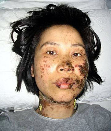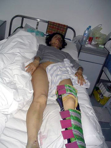 Bei dem Versuch der unmenschlichen Folter zu entfliehen, sprang Fr Rongrong schließlich in einem Akt der Verzweiflung aus dem zweiten Stock eines Bürofensters und brach sich dabei das Becken und die Ferse. Im Krankenhaus bot sich die Möglichkeit, die unsagbaren Qualen der jungen Frau fotographisch festzuhalten.