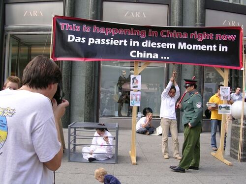 An einer gut einsichtigen Stelle ist es anders: die ohrenbetäubende Musik kommt von nebenan, die Leute hier verhalten sich ruhig. Zu einer angenehmen Hintergrundmusik heben und senken sich gemächlich die Arme der Übenden. Ein paar Falun Gong Praktizierende in Gelb informieren Passanten, andere teilen Informationsmaterial aus. Es ist in dem Trubel ein Ort der Stille - mit einer friedlichen Atmosphäre. Und doch ist das, was hier noch zu sehen ist, wirklich aufsehenerregend: ein chinesischer Polizist, mit einer Zigarette im Mund, marschiert vor zwei blutigen Folteropfern mit einem Elektrostab auf und ab. Darüber ist ein Banner zu sehen mit "das passiert in diesem Moment in China...", und unmittelbar daneben mit einer Friedenstaube: "Gemeinsam für ein Ende der Verfolgung von Falun Gong in China!"