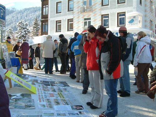 Ende Januar 2005 wurde das jährlich stattfindende Weltwirtschaftsforum im berühmten Schweizer Skiort Davos abgehalten. Während der letzten beiden Tage des Treffens organisierten Falun Gong Praktizierende in der Schweiz eine Anti-Folterausstellung und andere Aktivitäten. Trotz der sehr kalten Witterung verwandelten die Praktizierenden für eine halbe Stunde den Platz im Stadtzentrum in eine Anti-Folterausstellung.