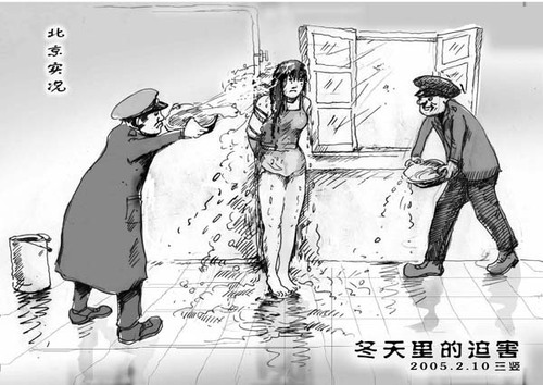 Eine bei der Folterung von Falun Gong Praktizierenden beliebte Methode stellt die so genannte Wasserfolter dar. Sie wird vor allem im Winter eingesetzt. In diesem Falle werden die Praktizierenden mit kaltem Wasser übergossen und mit nasser Kleidung am offenen Fenster oder im Freien stehen gelassen, was Erfrierungen und schwere Unterkühlungen hervorruft.