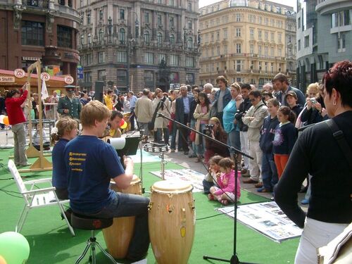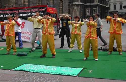 Es war ein warmer Frühlingstag und viele Menschen belebten die Wiener Innenstadt. An die 6 Stunden wurde der Welt Falun Dafa Tag, der für die Praktizierenden von besonderer Bedeutung ist gefeiert. Durch die Verfolgung von Falun Gong in China zeigten die Praktizierenden aber nicht nur ihre Freude, sondern drückten mit einer Anti-Folterausstellung auch ihr Bestreben, diese böse Verfolgung zu entlarven und ihr Einhalt zu gebieten, aus. Am Programm stand auch eine Live Band und ein Theaterstück, dass über die Veröffentlichung von Falun Gong, die schnelle Verbreitung durch alle Gesellschaftsschichten und die plötzliche und völlig ungerechte Verfolgung von Falun Gong erzählte. Die Übungen von Falun Gong wurden in traditionellen, gelben Anzügen vorgezeigt und per Mikrofon den Zuschauern erklärt. Neben den Erklärungen über die Wirkung der Übungen machte der Sprecher auch auf die Verfolgung in China aufmerksam und bat die Zuschauer, die am Infostand aufliegenden Unterschriftsaktionen zu unterzeichnen.