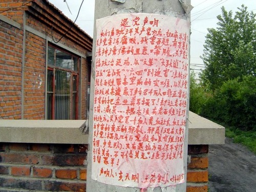Am 15. Juni 2005 war eine Austrittserklärung einer Person aus der KPC auf einem Versorgungsmast aus Zement an einer Straße im Bezirk Qiezihe in der Stadt Qitaihe angebracht.