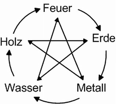 Die fünf Elemente bilden sich aus: Holz (Aufbruch), Feuer (dynamische Phase), Erde (Veränderung), Metall (Reife) und Wasser (Ruhe).