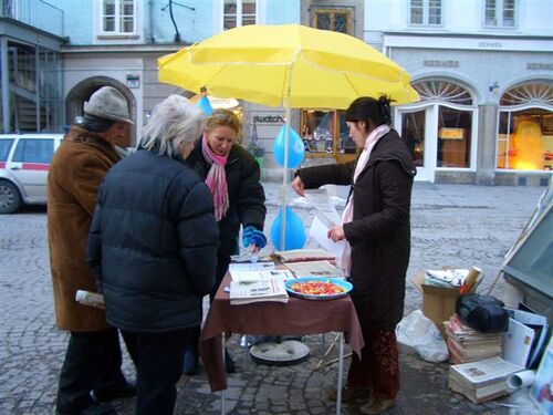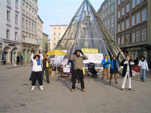 Am Samstag darauf hielten österreichische Falun Gong Praktizierende einen Infotag, zum Gedenken 1000ender zu Tode gefolterter Falun Dafa Praktizierender in China, ab. Es wurden die Übungen gezeigt und Unterschriften gesammelt. Jeder Passant, der den Appell "Stoppt den Terror der KPC" mit einer Unterschrift unterstützte, bekam eine wunderschöne kleine Lotusblüte aus Papier mit nach Hause. Auch hier wurde ein Sonderdruck der „Neun Kommentare“ neben dem anderen Falun Dafa Material ausgeteilt. Einige Passanten wollten sogar direkt am Platz die