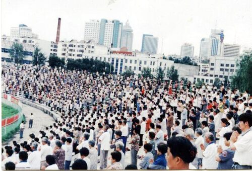 Am 16. Januar 2006 um ca. 13:00 Uhr verhafteten Zivilpolizisten zwei Falun Dafa-Praktizierende, als sie im Laodong Park Informationsmaterial an Passanten verteilten. Das Bild zeigt die Situation vor der Verfolgung im Juli 1999, wo sich tagtäglich tausende Menschen friedlich zum gemeinsamen Üben auf öffentlichen Plätzen treffen konnten.
