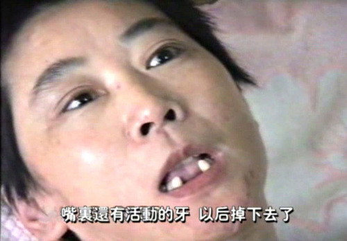 Am 9. April 2003 haben sie mich auf einer Krankentrage zum Dalian Arbeitslager gebracht. Am darauf folgenden Tag haben der Polizist Han und zwei Insassen, Zhao Xiujia und Xie Xiaoli mich auf den Boden gedrückt und wollten mich zwangsernähren. Sie hebelten mit einem Holzstock meinen Mund auf, sodass zwei Zähne ausbrachen (siehe Bild).