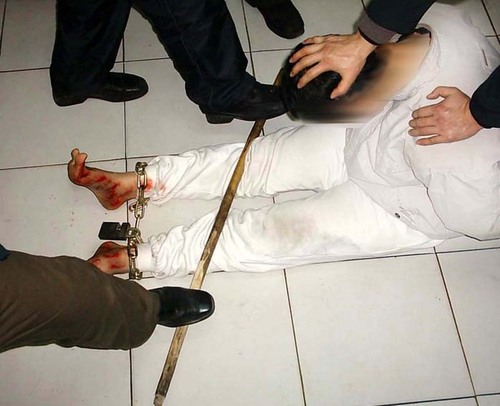 Seit dem Beginn der Verfolgung im Jahr 1999 foltert und quält die Polizei der Stadt Shenyang systematisch Falun Gong Praktizierende. Das Bild zeigt die Nachstellung einer "beliebten" Methode: harte Holzstäbe auf den Beinen hin- und herrollen.
