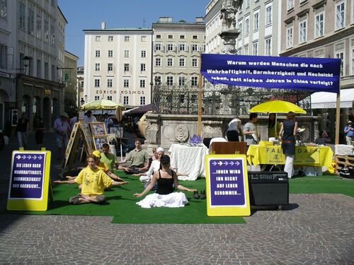 Anlässlich des siebenten Jahrestages der Verfolgung an Falun Gong Praktizierenden auf dem Festland China hielten Praktizierende aus Österreich und Süddeutschland am Samstag, 15. Juli 2006 eine Informationsveranstaltung in Salzburg ab, um die Öffentlichkeit über die grausamen Menschenrechtsverletzungen der Kommunistischen Partei Chinas (KPC) aufzuklären. Ein besonderer Schwerpunkt lag dabei auf den illegalen Organentnahmen an lebenden Falun Gong Praktizierenden.