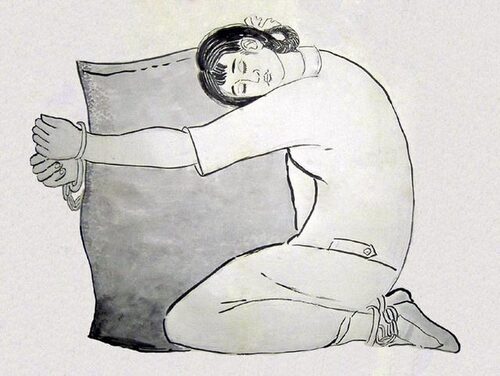 Das Bild zeigt eine der zahlreichen Foltermethoden, die im Untersuchungsgefängnis Nr. 2, der Stadt Handan, Provinz Hebei, bei weiblichen Falun Gong Praktizierenden angewandt wird, die weiterhin ihren Glauben an Falun Gong nicht aufgeben wollen. Den Praktizierenden wird eine Handschelle und eine Fußkette in der Form angelegt, dass sie einen Jutesack in den Armen halten müssen.