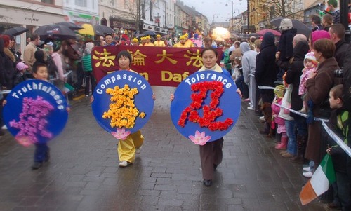 Der St. Patrick's Tag findet weltweit am 17. März statt. Falun Gong Praktizierende außerhalb Irlands haben mehrmals an Paraden zum St. Patrick's Tag teilgenommen, doch 2007 war die irische Gruppe das erste Mal bei der Parade in Port Laoise dabei. Die Vorführung der Meditationspraktik, begleitet von schönen traditionellen chinesischen Tänzen und donnernden chinesischen Trommeln, wurde vom Publikum begeistert aufgenommen.