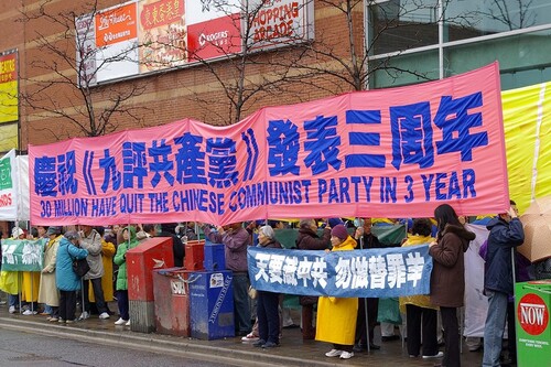 Am Nachmittag des 12. April 2008 fand im Zentrum von Toronto (Chinatown) eine Zusammenkunft statt, um die 35 Millionen Austrittserklärungen von Chinesen aus der Kommunistischen Partei Chinas (KPCh) und deren angegliederten Organisationen zu feiern.