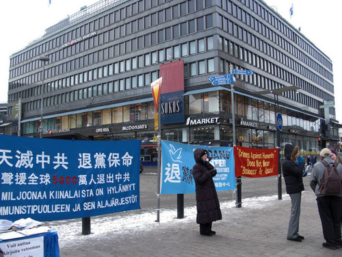 Am 14. 2. kamen Ehrenamtliche des nordeuropäischen "Service-Zentrums zum Austritt aus der Kommunistischen Partei Chinas" und einige finnische Falun Gong Praktizierende zum Hauptbahnhof in Helsinki, um die ca. 50 Millionen Chinesen, die bereits aus der Kommunistischen Partei Chinas (KPCh) ausgetreten sind, zu unterstützen und forderten zugleich ein Ende der Verfolgung von Falun Gong.
