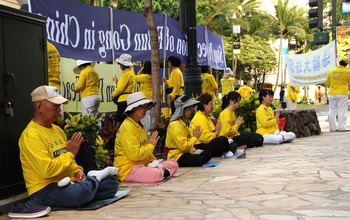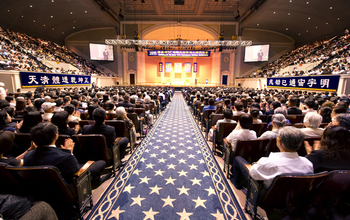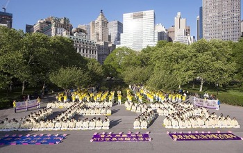 Am 11. Mai 2012, einem wunderschönen Nachmittag, versammelten sich über 500 Falun Dafa-Praktizierende aus Taiwan und anderen asiatischen Ländern im bekannten Battery Park im Süden von Manhattan, von dem aus die Freiheitsstatue und der Hudson River zu sehen sind, um den 20. Jahrestag der Veröffentlichung von Falun Dafa zu feiern, die Übungen gemeinsam zu praktizieren und zwei Worte zu formieren.